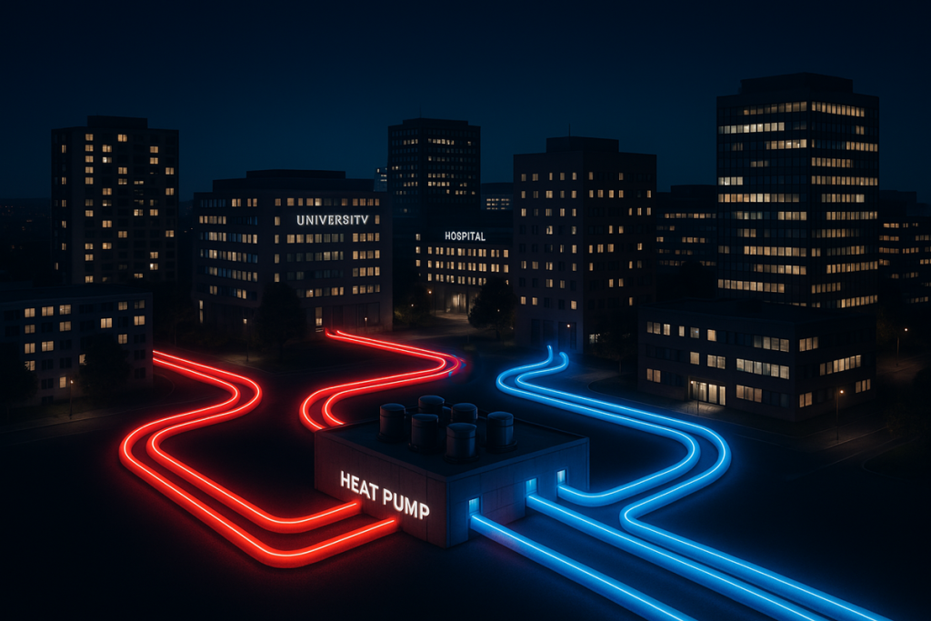 Kiinteistöjen kaikki hukkalämmöt ja uusiutuva energia voidaan kierrättää lähes päästöttömäksi kaukolämmöksi kaukokylmäverkon kautta.